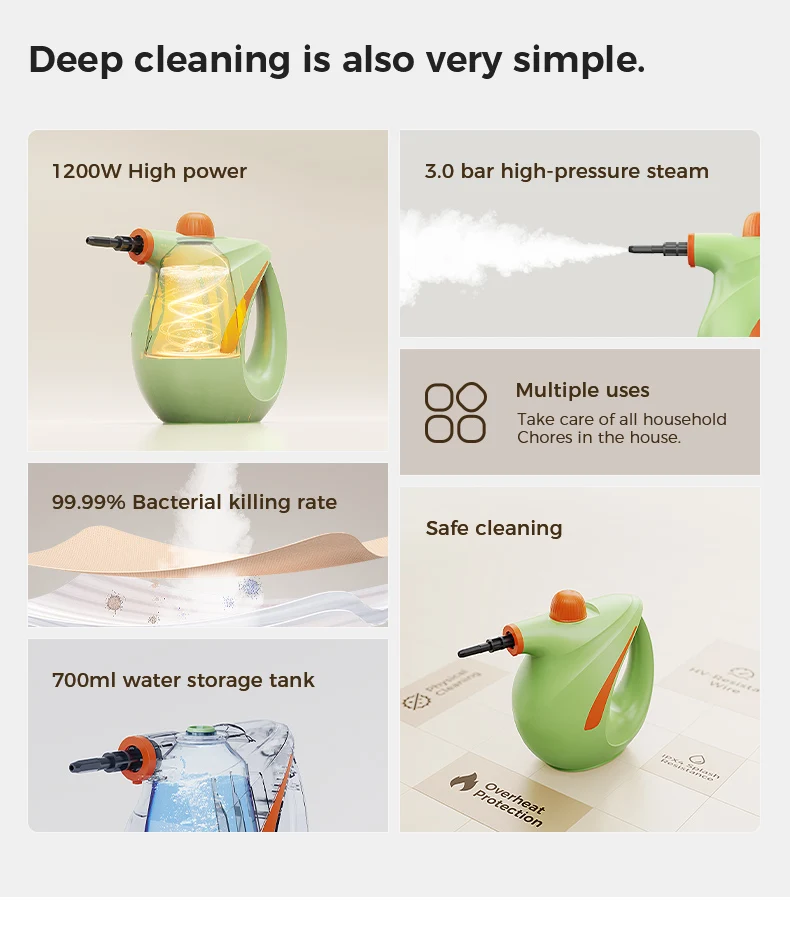 3.0Bar high-pressure steam penetrates deep to remove stubborn dirt and grease.